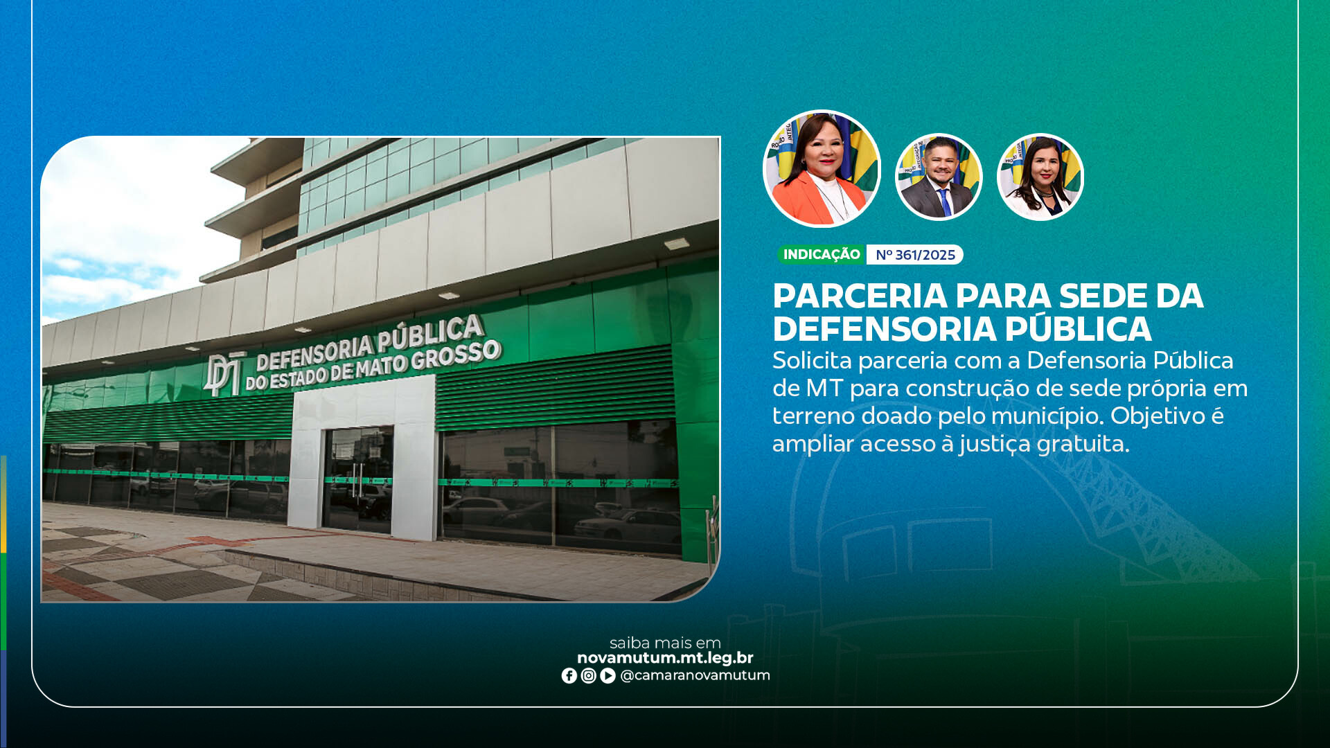 O município já realizou a doação de um terreno urbano de 1.200 m² à Defensoria Pública, localizado no Paço Municipal, na Rua das Seringueiras, área estratégica situada nos fundos do Fórum Estadual e ao lado do Ministério Público. A proposta apresentada pelos parlamentares busca fortalecer o diálogo entre o Executivo e a Defensoria, facilitando os trâmites necessários para a implantação da estrutura física, considerada crucial para melhorar o atendimento prestado à comunidade.