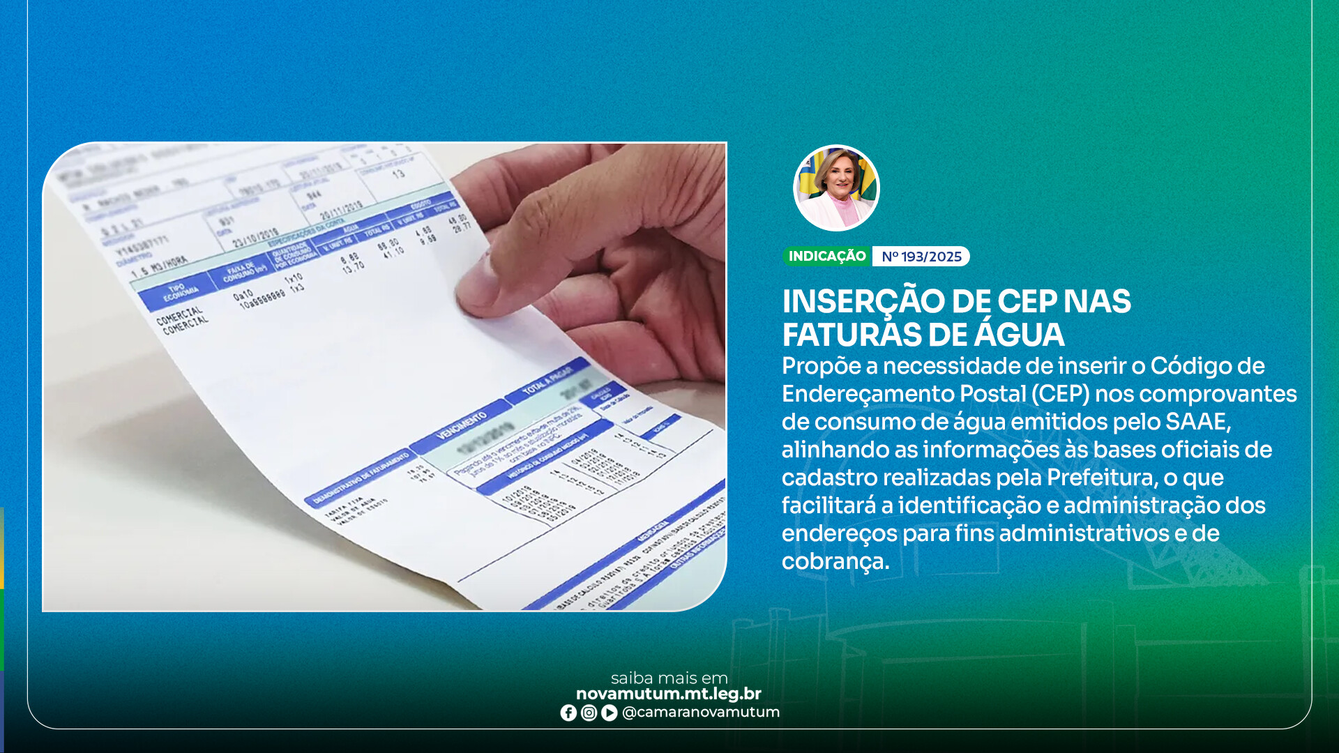 A parlamentar destacou que muitos moradores enfrentam dificuldades ao utilizar a conta de água como comprovante de endereço, já que o documento atualmente não traz o CEP cadastrado oficialmente pela prefeitura. A medida beneficiaria especialmente os mutuenses que necessitam regularizar documentos ou receber encomendas, eliminando divergências nas informações postais.