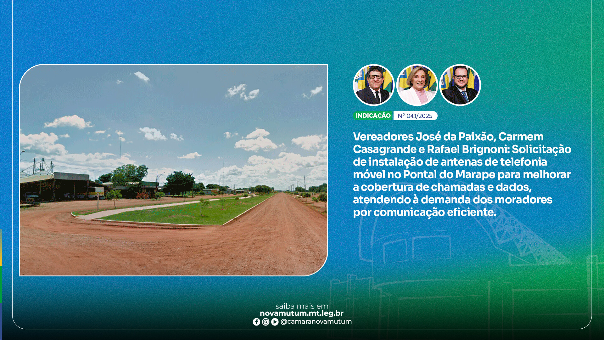 Na 6ª sessão ordinária da Câmara de Vereadores de Nova Mutum, realizada na noite desta segunda-feira (10/03), os vereadores José da Paixão (UNIÃO BRASIL), Carmem Casagrande (UNIÃO BRASIL) e Rafael Brignoni (PL) apresentaram a Indicação nº 043/2025, solicitando ao Executivo Municipal a instalação de antenas de telefonia móvel na comunidade do Pontal do Marape. A proposta visa garantir cobertura de sinal para chamadas e dados móveis, atendendo a uma demanda antiga dos moradores da região.
