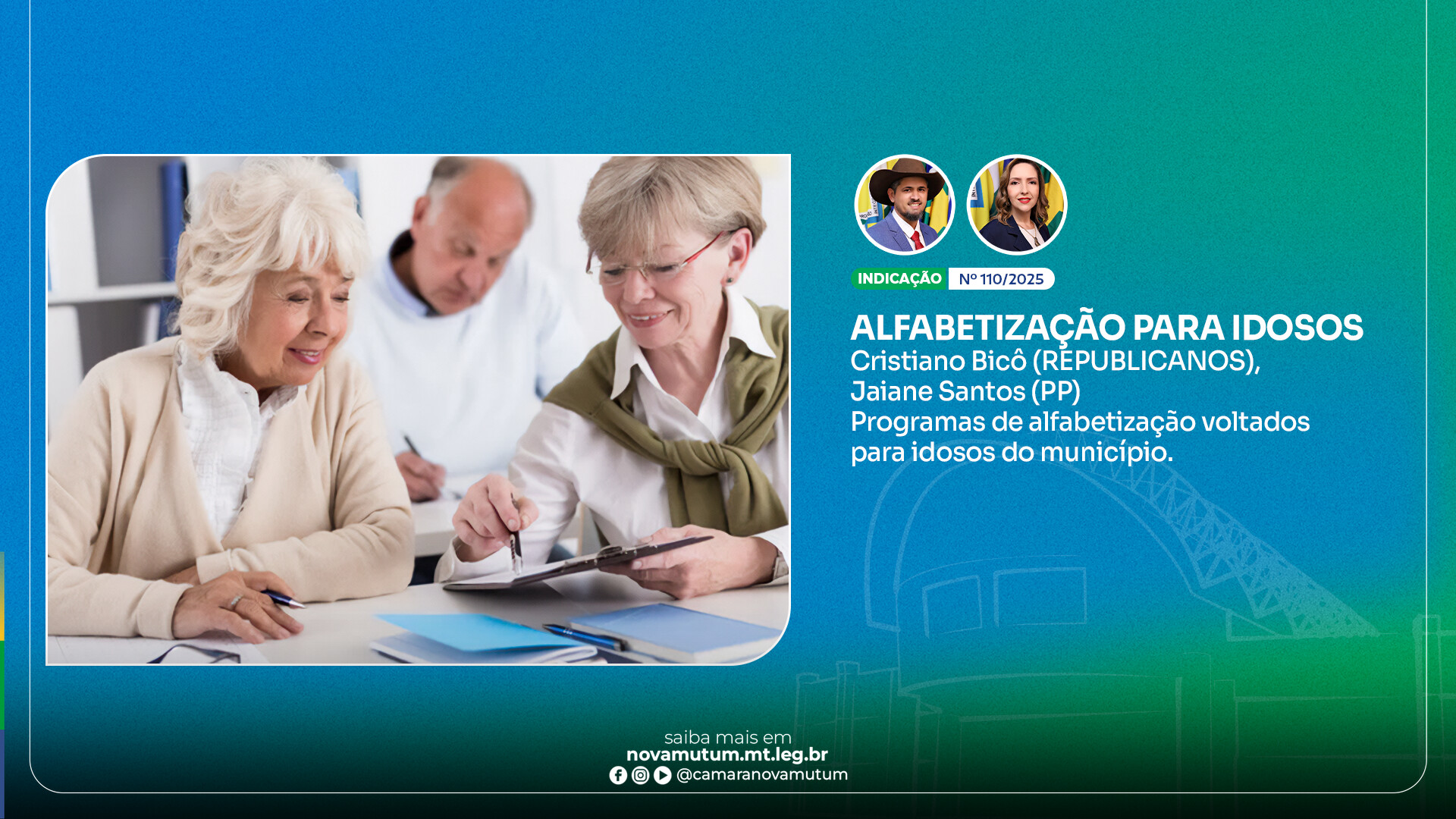 Em iniciativa que visa promover inclusão social e valorizar a terceira idade, os vereadores Cristiano Bicô (REPUBLICANOS) e Jaiane Santos (PP) apresentaram a Indicação nº 110/2025, solicitando ao prefeito a criação de um programa municipal de alfabetização para idosos em Nova Mutum.